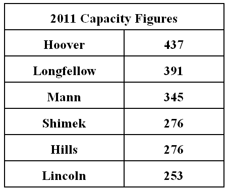 The high-end capacity figures do seem too high to me. I do suspect that 304 for Hoover is an "ideal-world" capacity, and that you could fit more students there before it would become truly overcrowded.